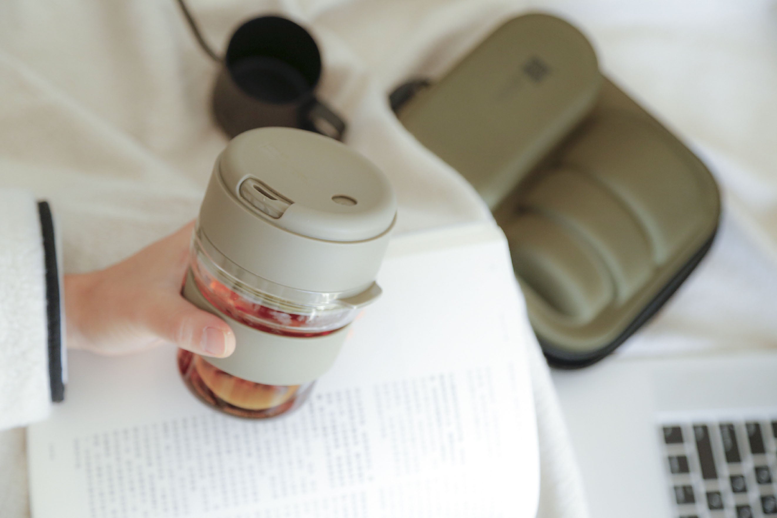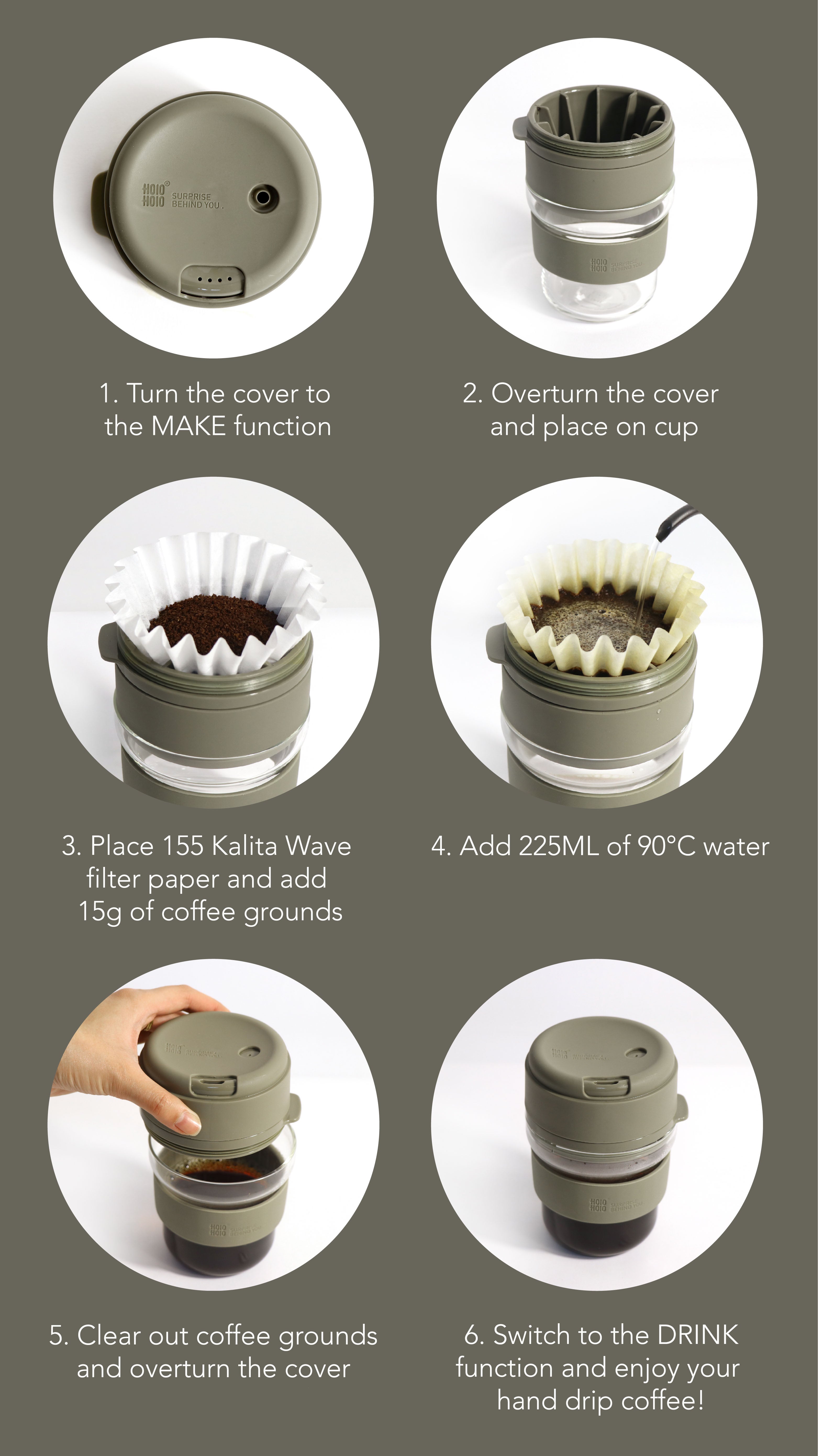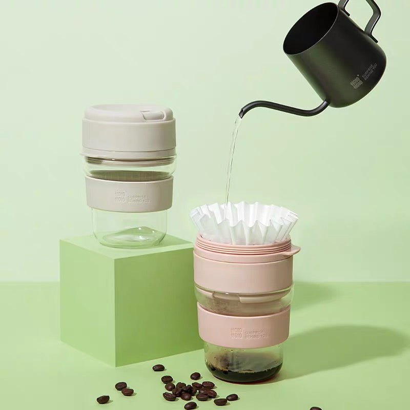 Turn the HOLOHOLO Coff Cup cover over and this portable glass cup becomes a drip coffee maker. Simple!
