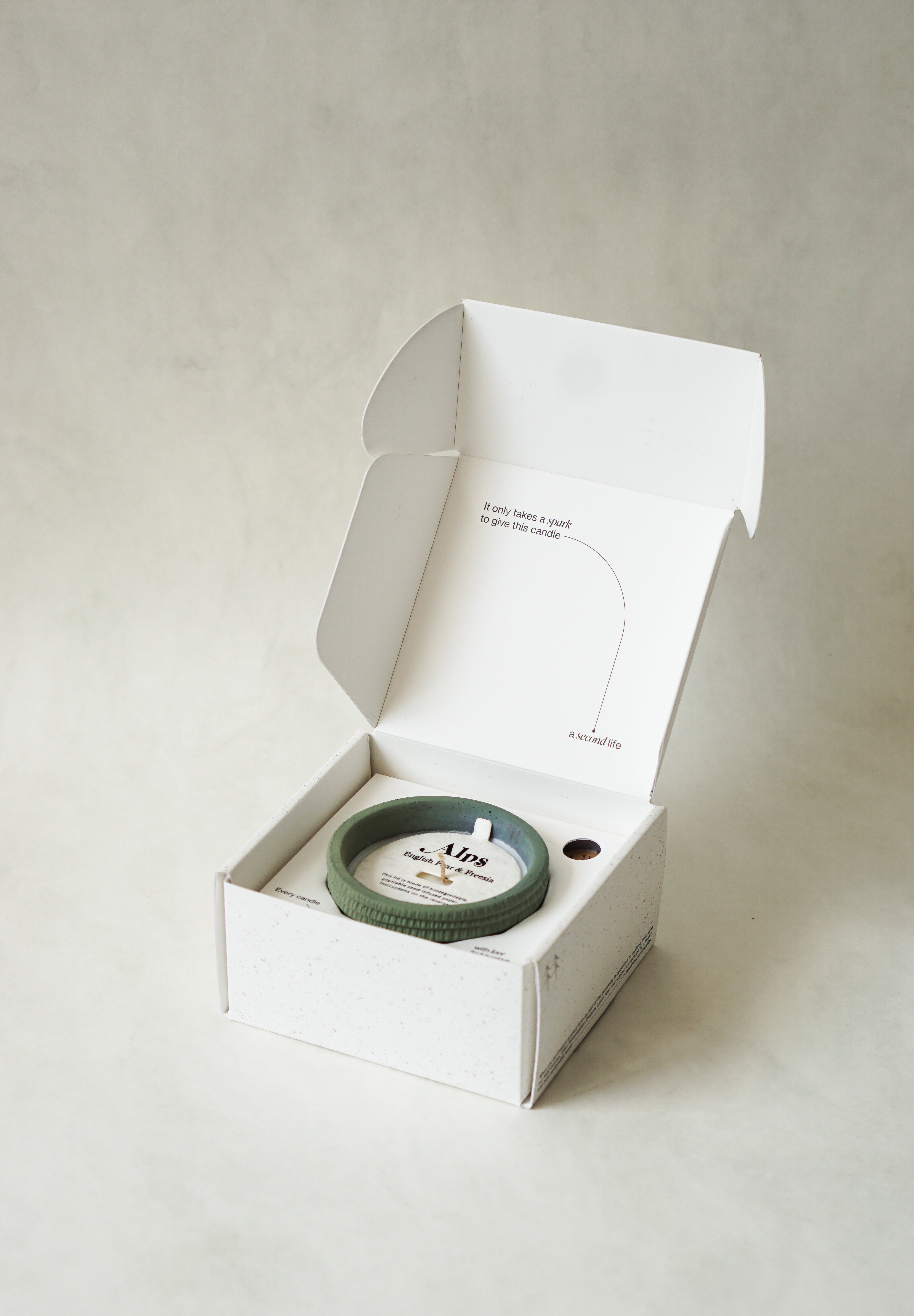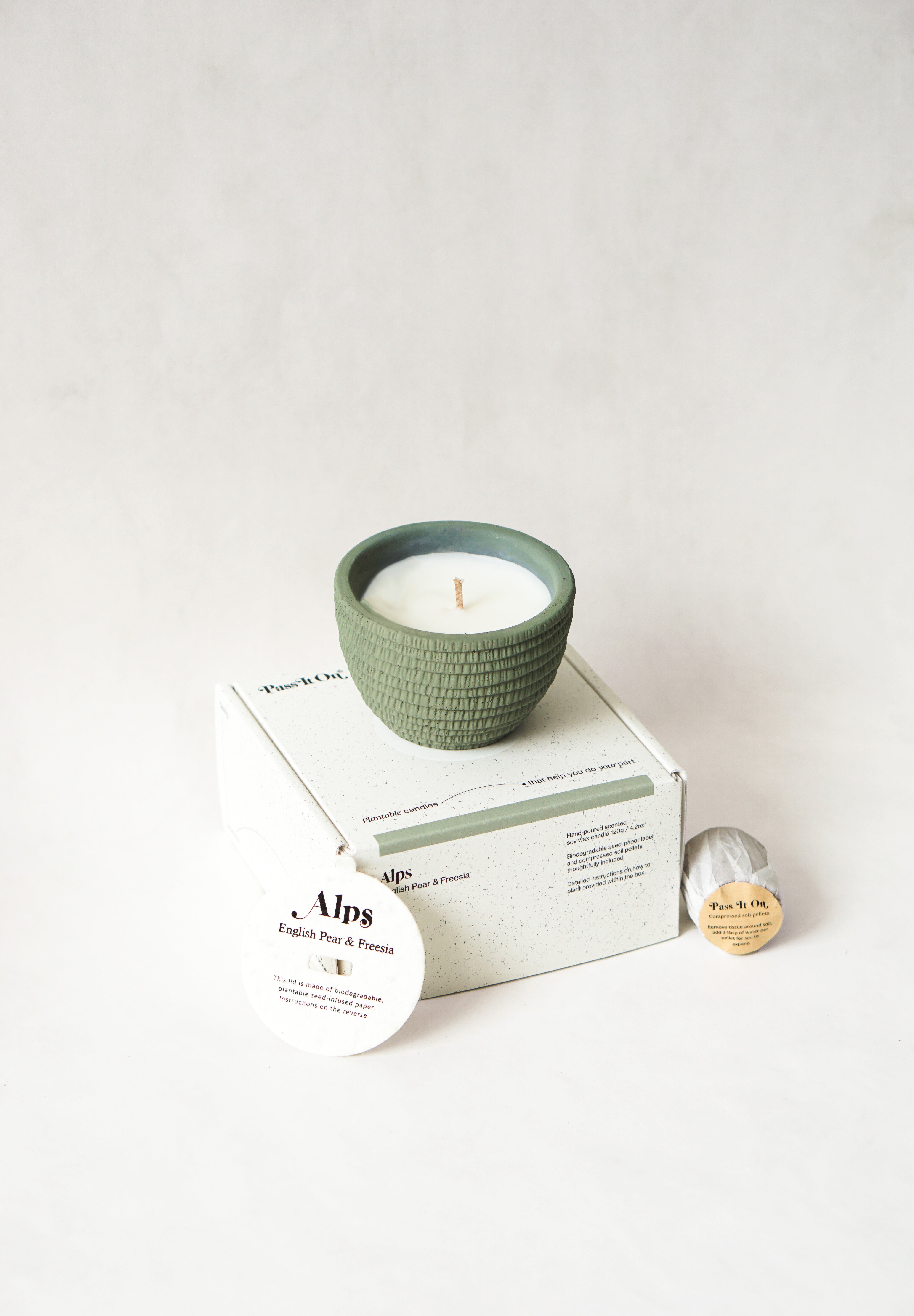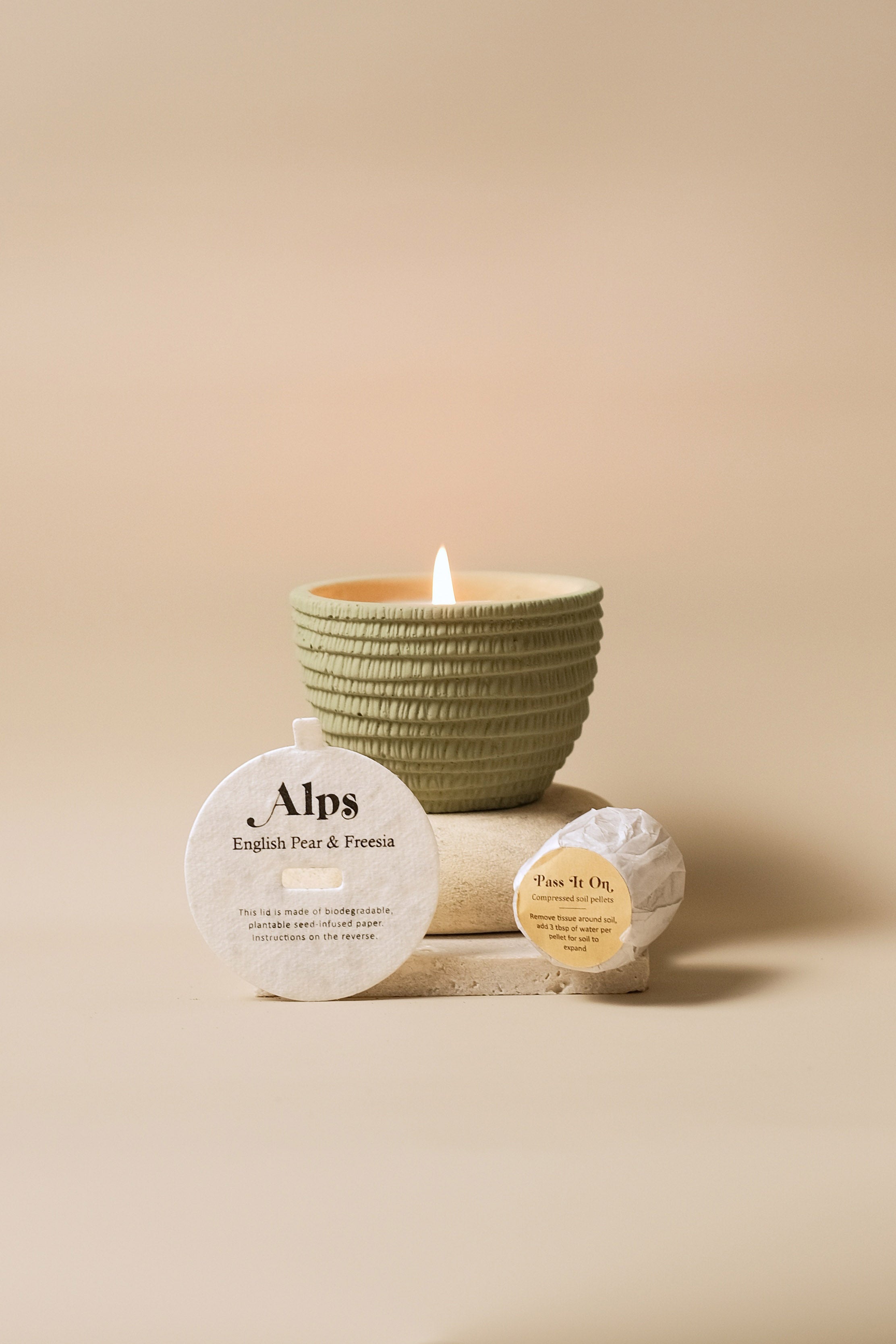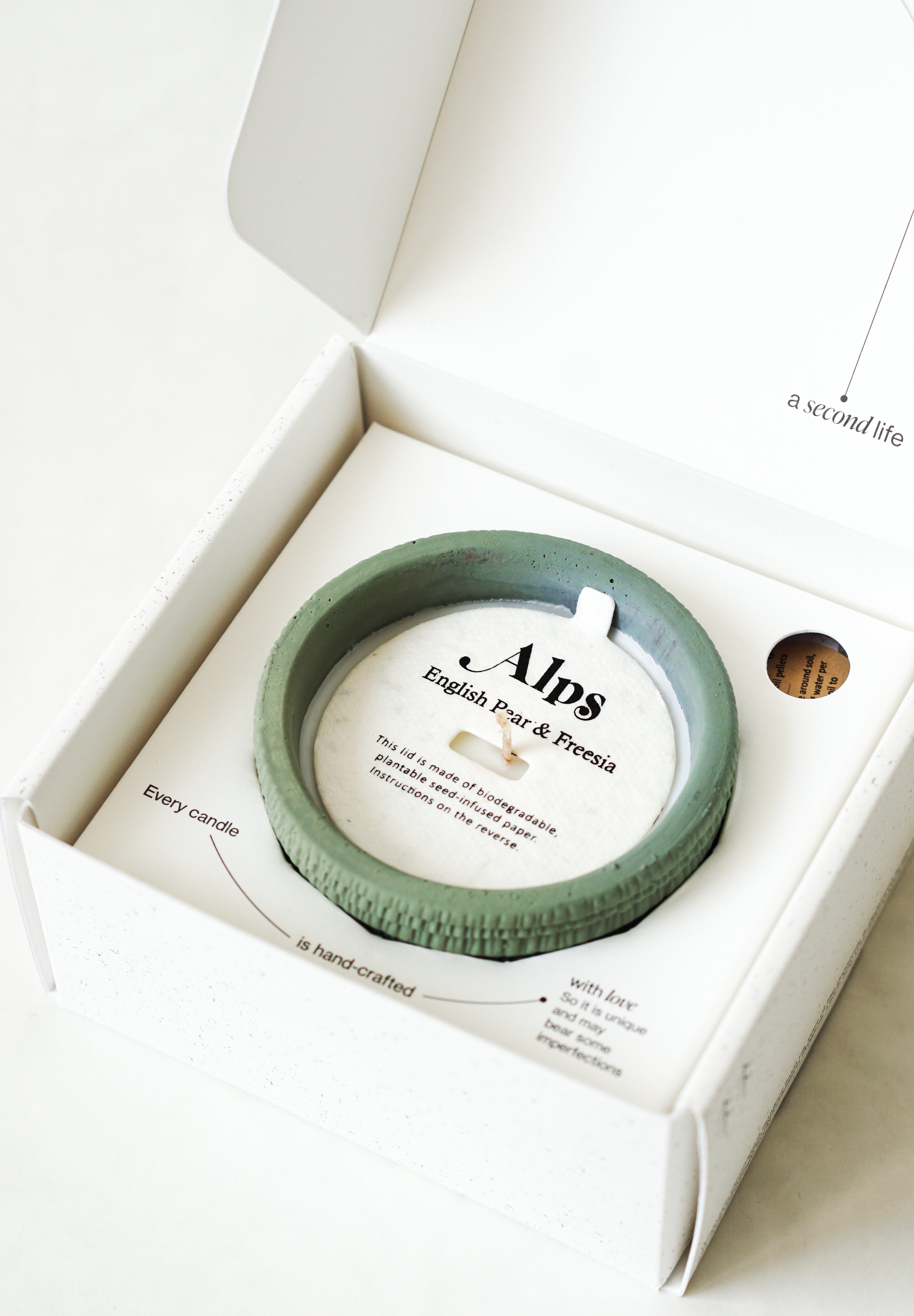 - Candle lid made of biodegradable, plantable seed embedded paper.
