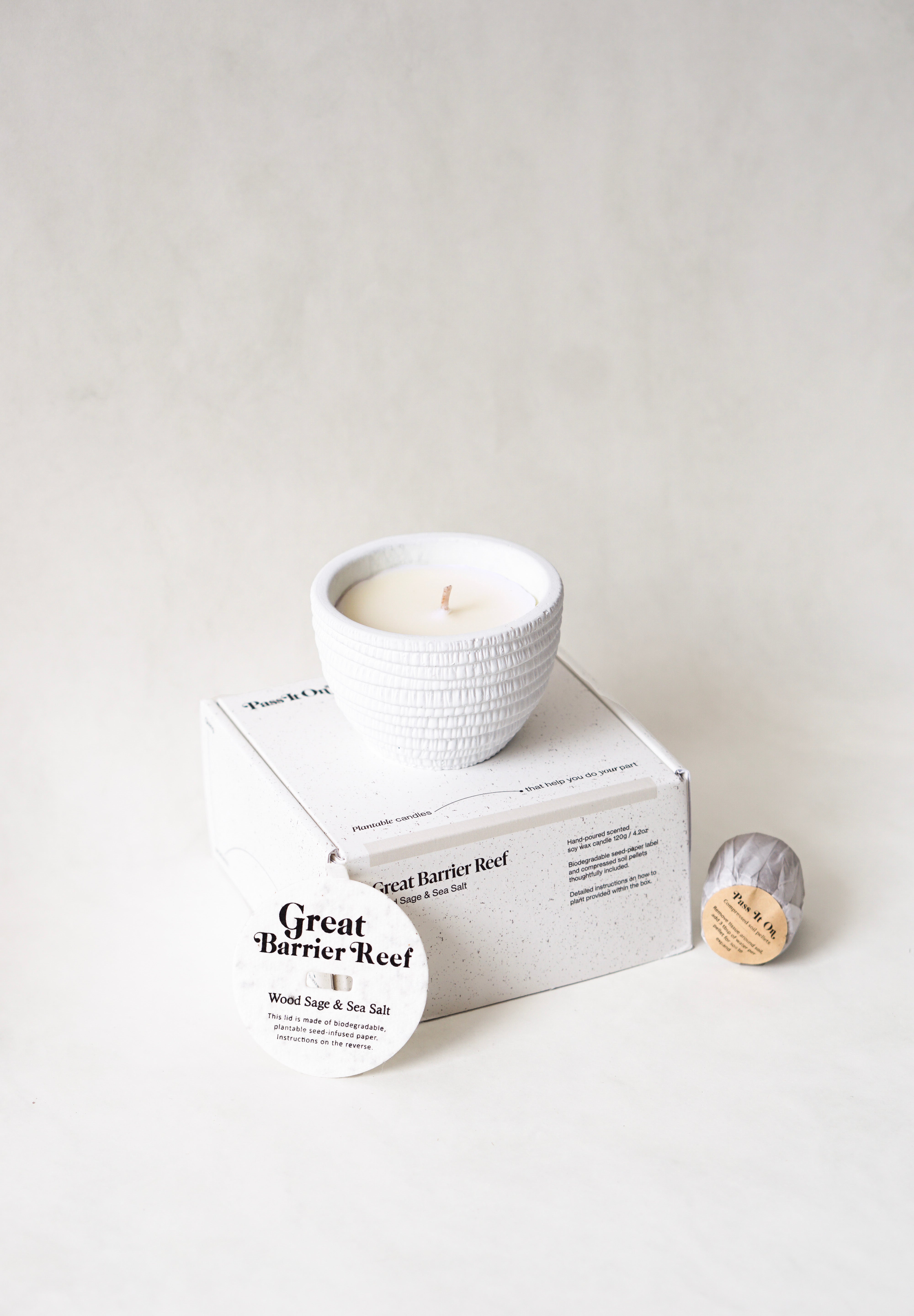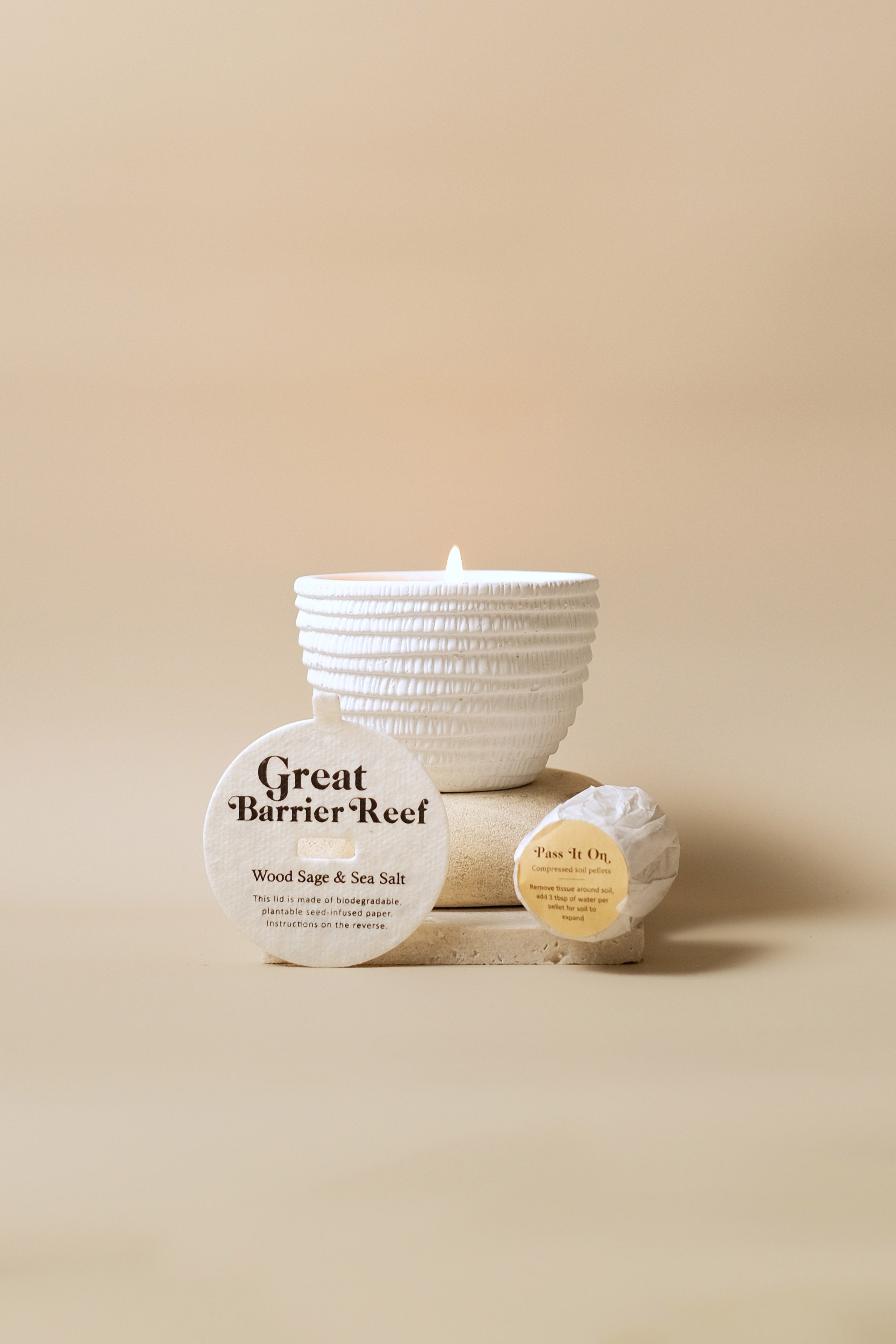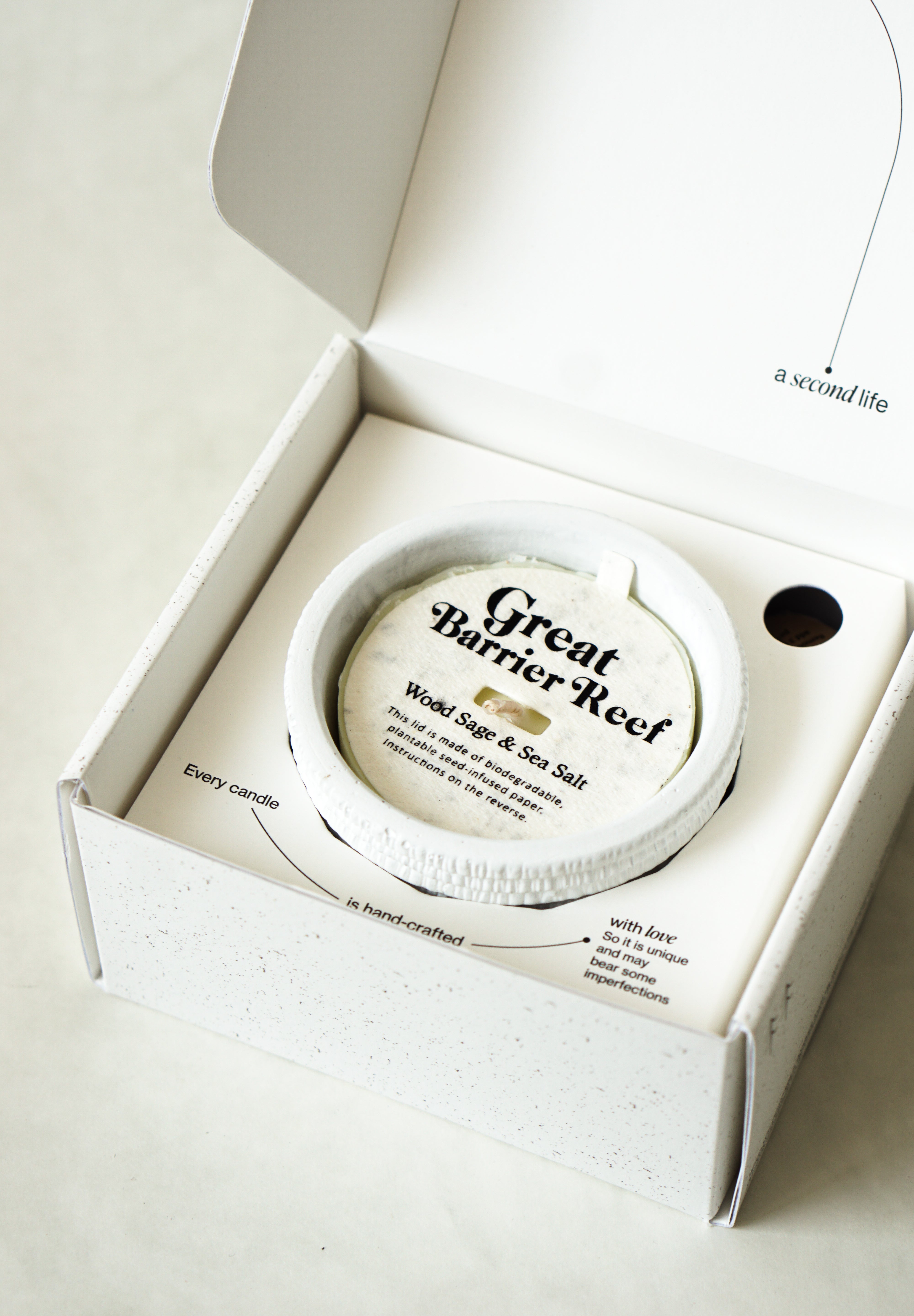 • Candle lid made of biodegradable, plantable seed embedded paper.