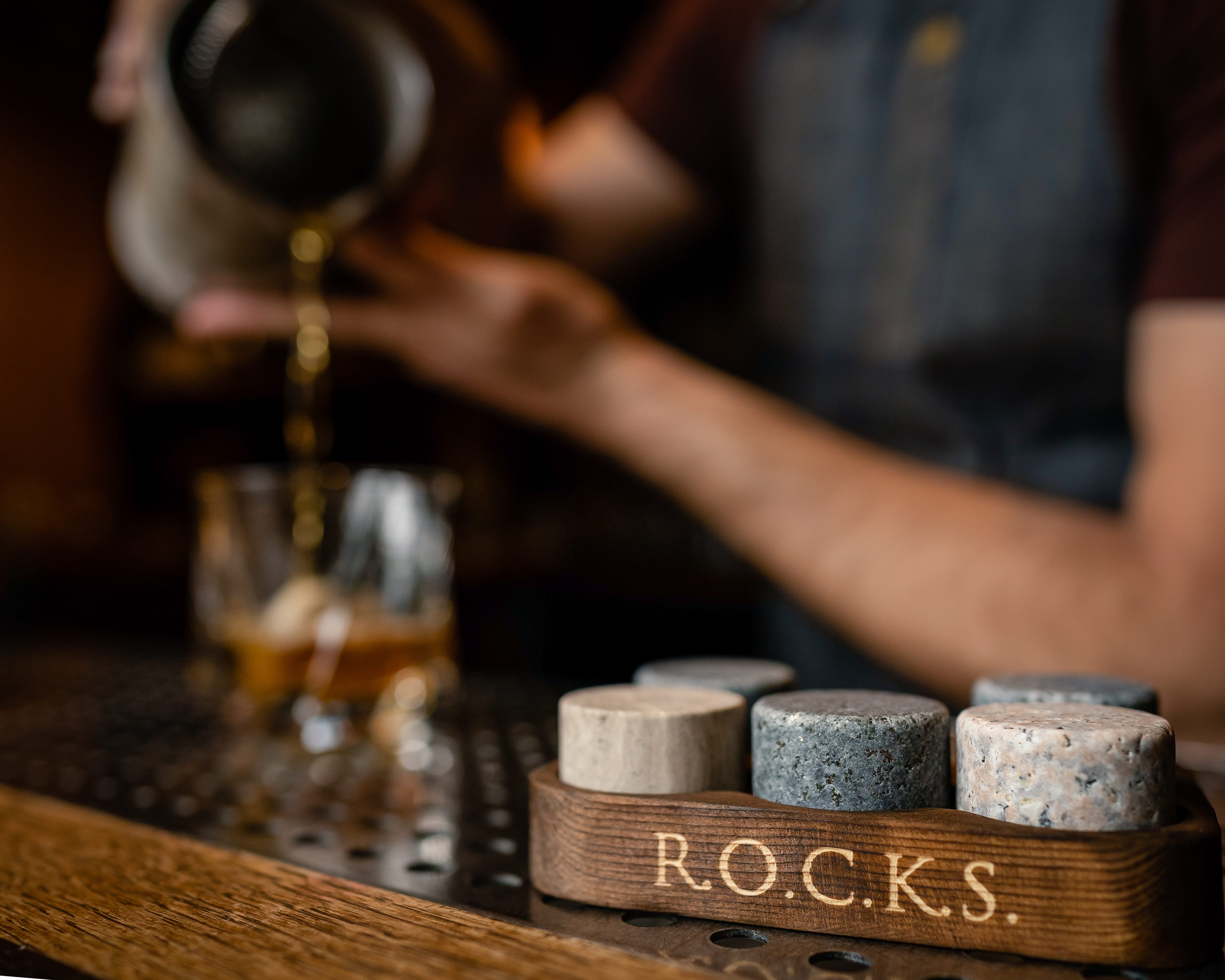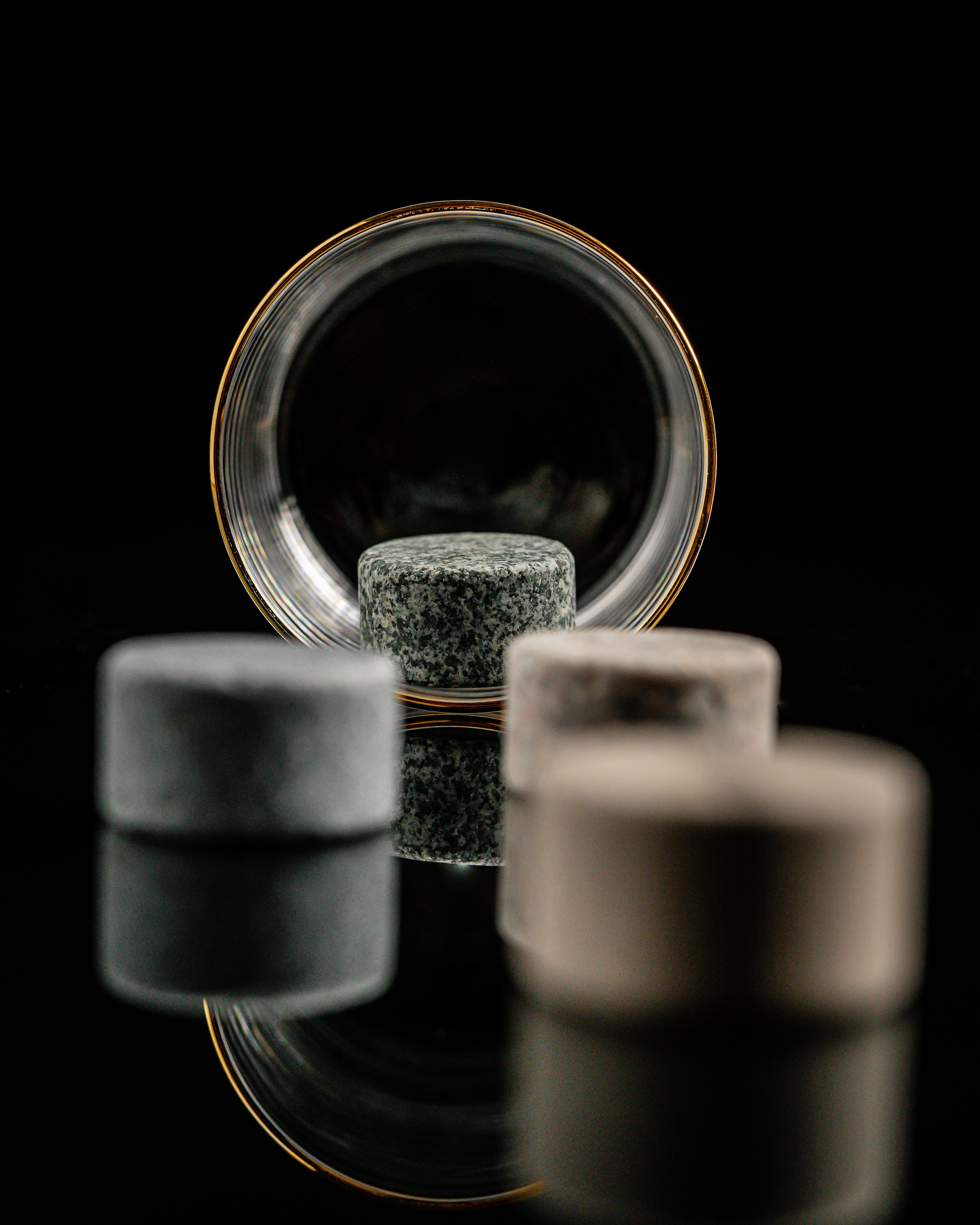 - Fast-cooling non-diluting round solid granite stones used to perfectly cool fine spirits without watering down your drink. The round edges will avoid scratching your glass unlike square-shaped stones. Indulge in a fine whiskey-tasting experience.
